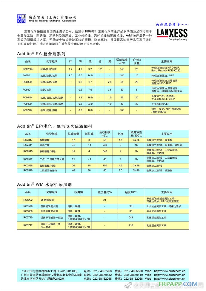 ------ R&O 油 -------- HL 液压油 -------- 燃汽和蒸汽汽轮机油 -------- 压缩机油 --------- 润滑脂 Additin RC9321是具有**的抗氧和防锈和中等抗磨性能的无灰添加剂复合剂, Additin RC9321,特别推荐用于下列高标准必须被满足的润滑剂的生产: - 高氧化安定性 - 优异的热稳定性 - 优异的水解安定性 - 无油泥形成 - 非常低的酸值 - 很好的铁和非铁金属防锈性能 - 很好的破乳化性能 - 很好的抗泡性能 上述性能可以在很低的加入量时以及在不同的基础油,例如在聚 α烯烃,烃类,HVI 和 II 类基础油中达到. 推荐加入量为为 0.3-0.6% (wt).?